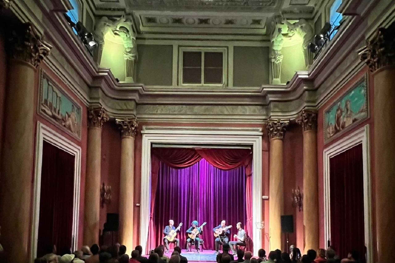 Flamenco-guitar og dans på det historiske Pignatelli-slot! Oplev noget anderledes! Har du lyst til at opleve noget anderledes? Mærk guitarens toner på det historiske Pignatelli-slot i det gotiske kvarter. Slap af efter en lang rejsedag med klassisk og flamenco guitarmusik fra en maestro-guitarist. ◾ Hyldest til Paco de Lucia Tre internationalt anerkendte maestro-guitarister - AlÍ Arango, Xavier Coll og Luis Robisco - og Spaniens mest berømte flamencodanser, José Manuel, i en fantastisk blanding af klassisk og flamencomusik. Mærk lidenskaben fra Barcelona. Nyd sange af Manuel de Falla, Federico García Lorca, Chick Corea og Paco de Lucia med Barcelona Guitar Trio. Vi tilbyder også en anden koncert på Palace of music Catalana. https://www.getyourguide.com/barcelona-l45/barcelona-guitar-trio-flamenco-dance-palau-de-la-musica-t546893/Includes
