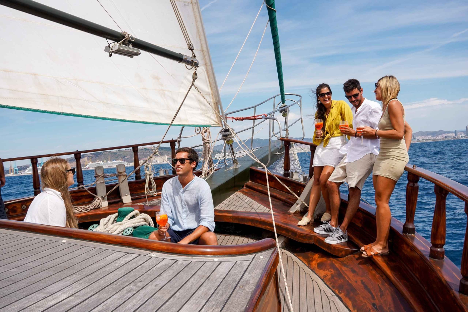 Immerse yourself in the magic of the Mediterranean in an unforgettable evening where live music and nature blend in perfect harmony. We invite you to embark on a magical journey aboard an elegant wooden sailboat. Choose the sunset option and enjoy the magic of sailing while the sun sets over the Mediterranean horizon! Our Turkish gulet, a classic of Mediterranean sailing, will transport you back in time with its wooden structure and elegant design. This boat is not just a means of transport, but a floating stage where every corner has been designed to offer comfort and spectacular views.Includes