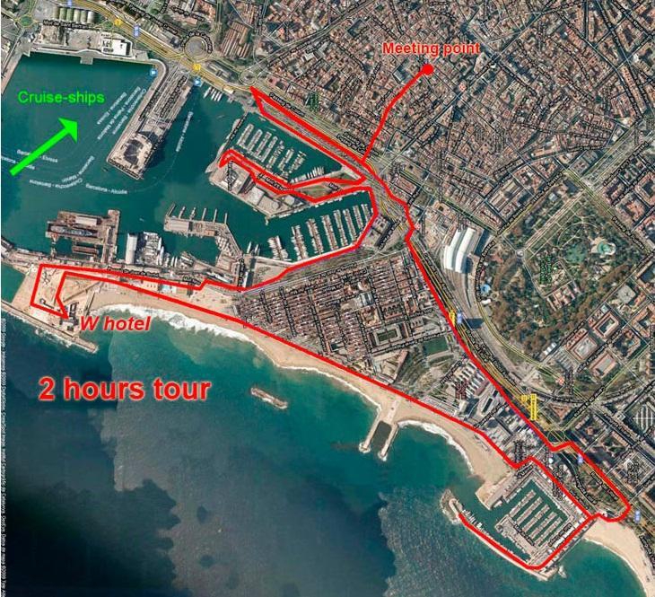 There exist only one official tour that starts in the heart of the Gòtic district, continues towards the end of Les Rambles promenade, then continues to the Port Vell (old harbour), coming up next to La Barceloneta, the old fishing district. From there it follows the sea front of Barcelona along the promenade next to the beaches up to the Olympic Village.
